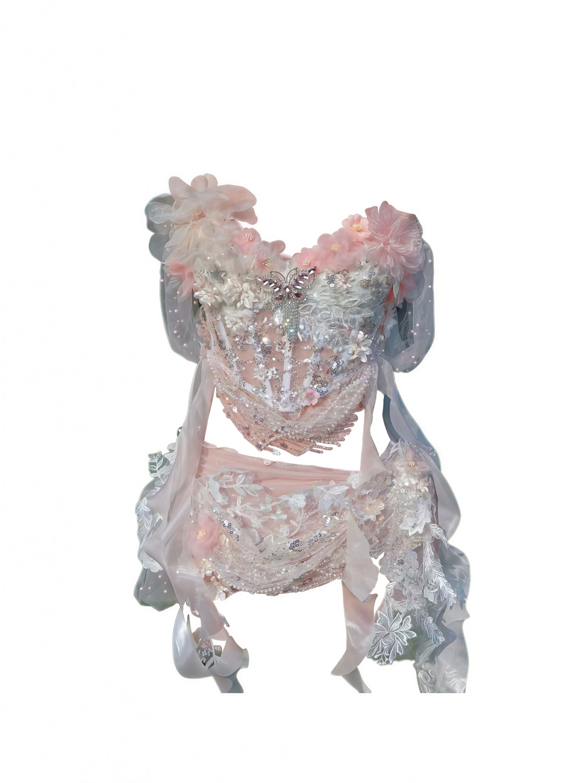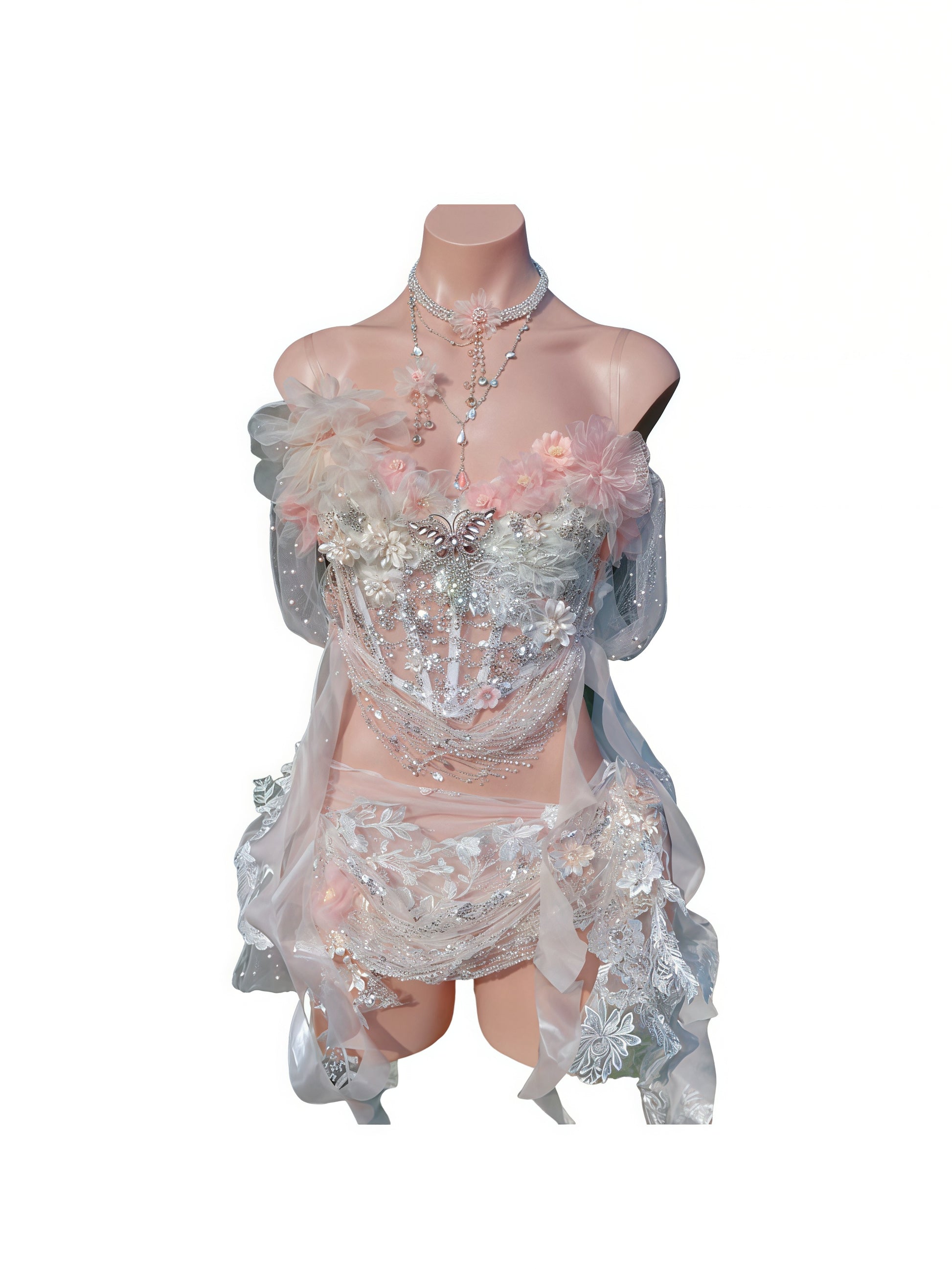 Aurélie is a girly fairy vision in light pink chiffon and lace, built upon a delicate corset with short skirts that shimmer with scattered rhinestones and shiny accents. Delicate pink and white floral details dance across the ensemble, capturing the enchanted sparkle of a moonlit garden.