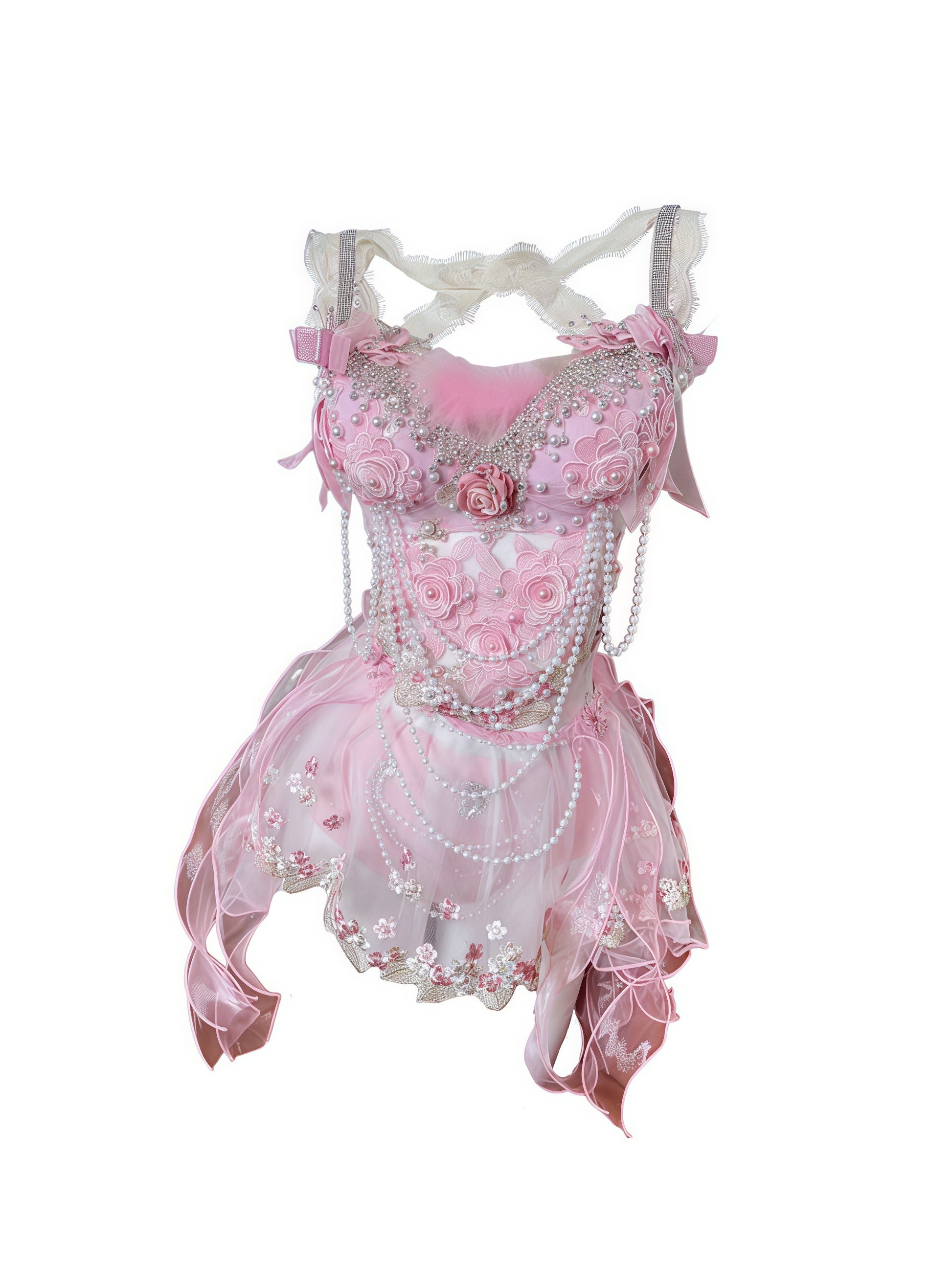 The Rosé Fairy Glimmer set is a delicate whisper of fairy magic, crafted from blush-pink lace embroidered with tiny roses and dotted with pearl dew. Lightweight and enchanting, its subtle shimmer and fluttering tulle are made for graceful, twirling movement.