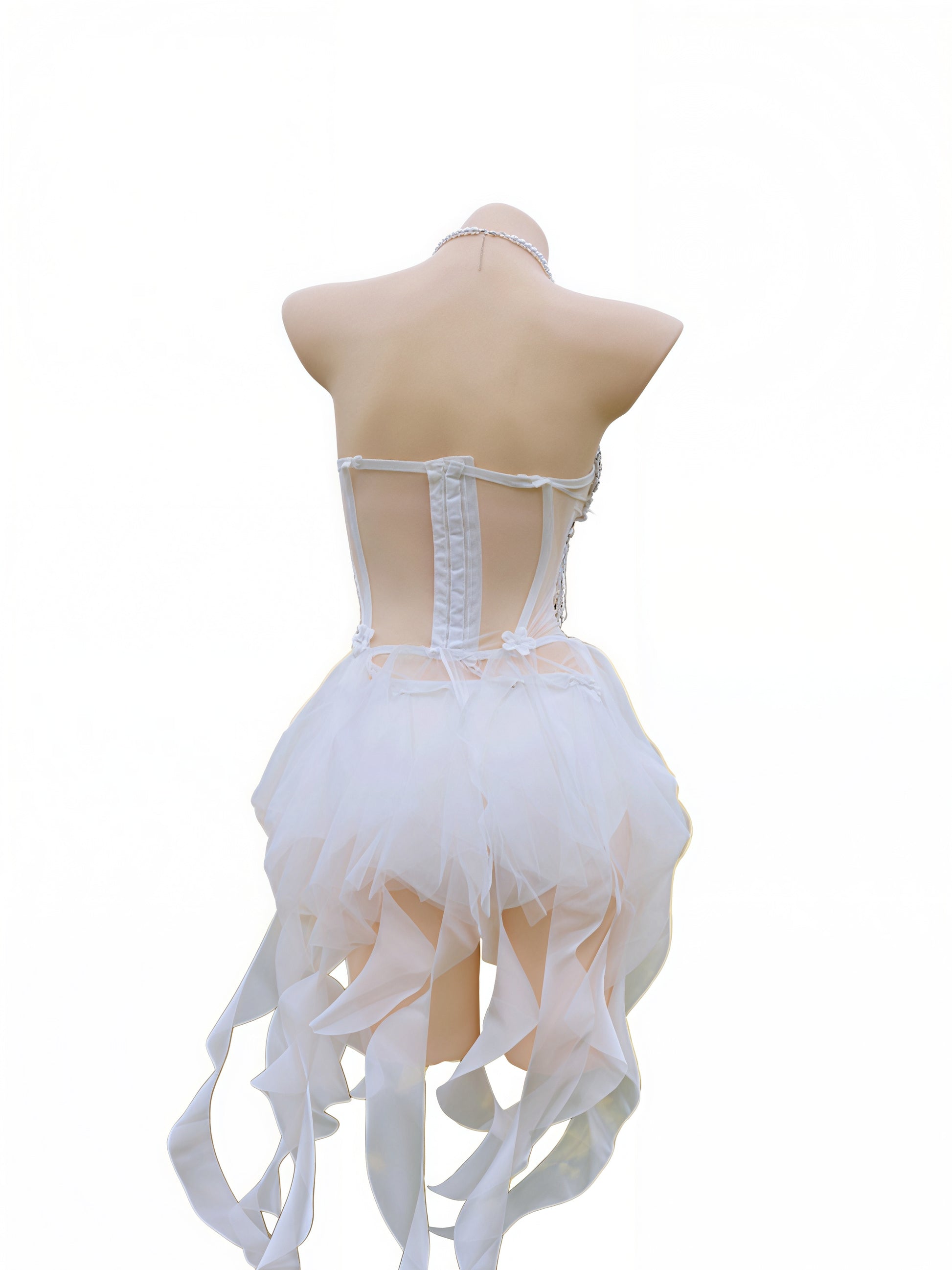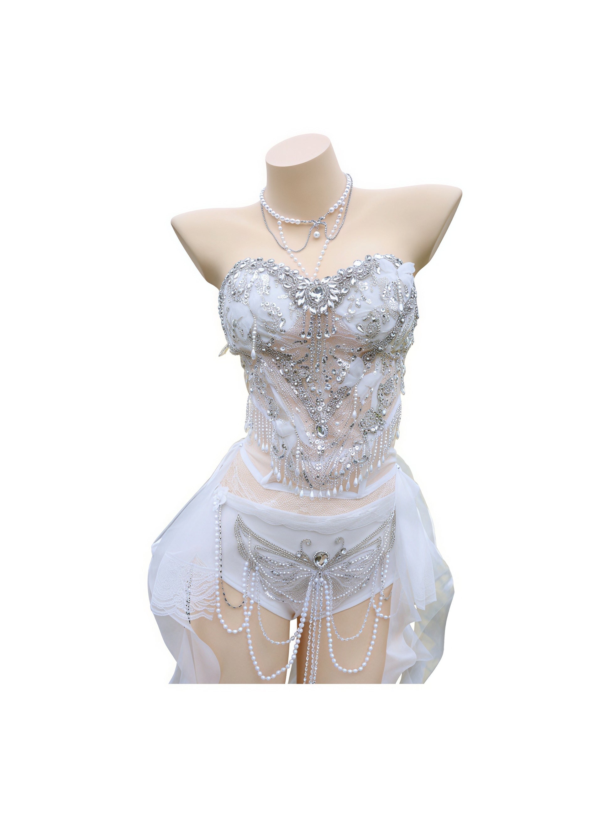 Seraphina is a celestial fairy dream featuring a strapless corset top in light white that shimmers with shiny pearls and rhinestones scattered like starlight across the bodice, paired with a fluttering short skirt that captures pure ethereal grace. This girly ensemble radiates shiny elegance from every delicate detail, embodying the luminous magic of a goddess descended from the heavens.
